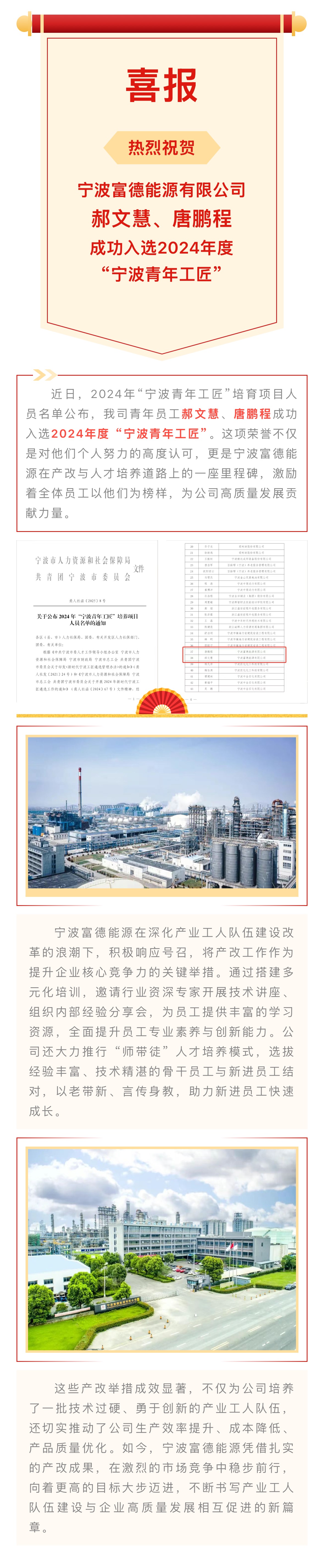 【熱烈祝賀】寧波富德能源有限公司郝文慧、唐鵬程成功入選2024年度“寧波青年工匠”